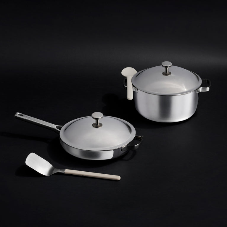 Each piece features a tri-ply construction that combines the high heat benefits of stainless steel or cast iron with the convenience of a nonstick effect. The original Always Pan and Perfect Pot also come in our iconic colors while this cookware has a chrome exterior.